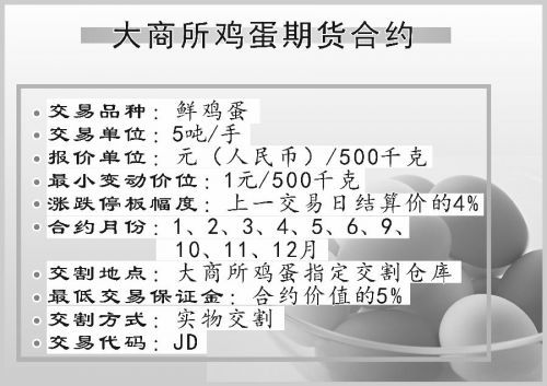 大商所昨日通知稱,雞蛋期貨合約已由證監(jiān)會批準(zhǔn),將于2013年11月8日(本周五)起上市交易。