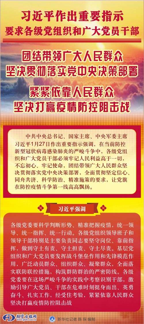 習近平強調(diào),各級黨委要科學判斷形勢、精準把握疫情,統(tǒng)一領導、統(tǒng)一指揮、統(tǒng)一行動。各級黨組織領導班子和領導干部特別是主要負責同志要堅守崗位、靠前指揮,做到守土有責、守土擔責、守土盡責?;鶎狱h組織和廣大黨員要發(fā)揮戰(zhàn)斗堡壘作用和先鋒模范作用,廣泛動員群眾、組織群眾、凝聚群眾,全面落實聯(lián)防聯(lián)控措施,構筑群防群治的嚴密防線。各級黨委要在這場嚴峻斗爭的實踐中考察識別干部,激勵引導廣大黨員、干部在危難時刻挺身而出、英勇奮斗、扎實工作,經(jīng)受住考驗,緊緊依靠人民群眾堅決打贏疫情防控阻擊戰(zhàn)。