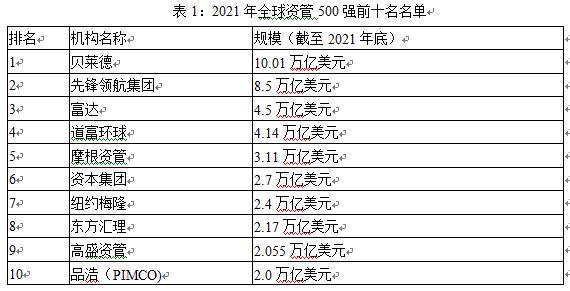 按照中國基金報報道,截至2021年底,全球資管500強的前十名主要是美國機構(gòu),除排名第8位的東方匯理是純歐洲機構(gòu)、排名第10的品浩(注冊在美國)的母公司注冊在德國外,其他8家機構(gòu)全部是美國機構(gòu)(如表1所示)。