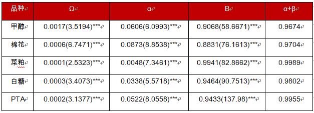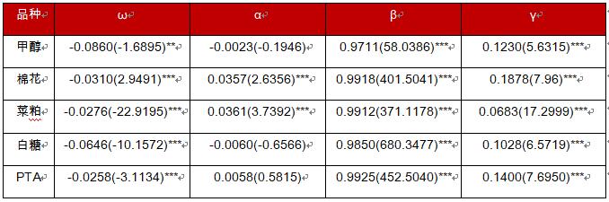 結(jié)論2:棉花和菜粕都存在顯著的非對稱性,這表明上漲行情波動率更容易出現(xiàn)大幅上漲。甲醇、白糖和PTA的波動率非對稱性不顯著,這表明上漲和下跌都會引起波動率上漲。