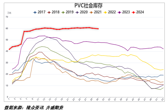PVC社會庫存居高不下,成為PVC反彈的最大阻力。春節(jié)過后,PVC社會庫存大幅累積并且持續(xù)走高,創(chuàng)出歷史新高,并且長期維持在60萬噸附近的高位。雖然二季度以來PVC檢修明顯增多,上游庫存大幅下降,但受制于需求偏弱,PVC社會庫存壓力并未緩解。不過,近期去庫逐漸自上而下傳導(dǎo),PVC社會庫存罕見去化,最新庫存已經(jīng)降至60萬噸以下,初步出現(xiàn)去化跡象。