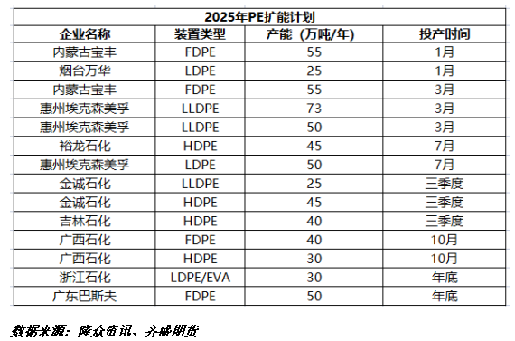 2025年是近幾年P(guān)E產(chǎn)能擴(kuò)張壓力最大的一年,也是此輪產(chǎn)能擴(kuò)張周期的最后一年。上半年P(guān)E產(chǎn)能擴(kuò)張壓力較小,除了一季度多套新裝置集中投產(chǎn)之外,二季度幾無(wú)新裝置投產(chǎn)。不過(guò),下半年P(guān)E仍將面臨吉林石化、裕龍石化、湛江巴斯夫等多套新裝置投產(chǎn)壓力,預(yù)計(jì)屆時(shí)總產(chǎn)能將突破4000萬(wàn)噸/年。