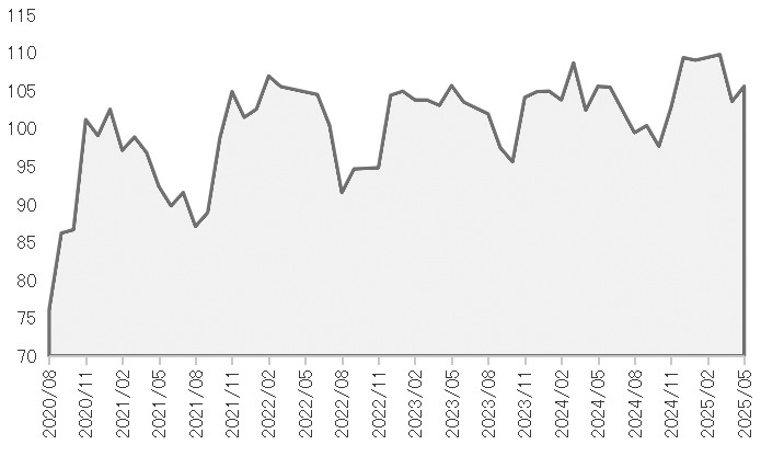 圖為印度煉油廠產(chǎn)能利用率指數(shù)(單位:%)