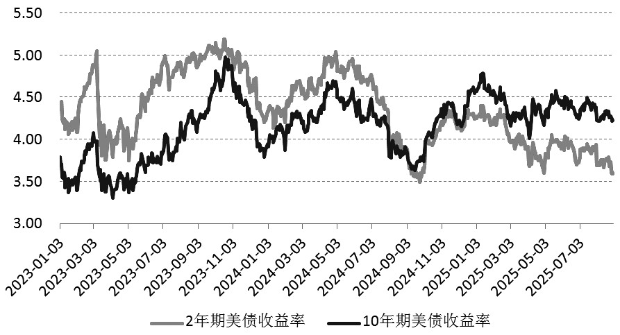7月開始,美國國會通過了“大而美法案”,美國債務上限提升至5萬億美元,美國財政部發(fā)債重回正軌,發(fā)債潮隨之而來。據(jù)美國財政借貸顧問委員會(TBAC)的預計,三季度,美債凈發(fā)行量達1萬億美元,其中長債約4700億美元;四季度凈發(fā)行量為5900億美元,其中長債4470億美元。在美國發(fā)債潮的催化下,美元流動性可能進一步收緊,美債利率在9—10月有繼續(xù)上行的趨勢,這進而倒逼美聯(lián)儲降息。芝商所 FedWatch工具顯示,美聯(lián)儲9月降息25個基點的概率為87.6%,因此,短端美債收益率將下行,而長端美債收益率可能不降反升,長短端美債利差擴大,收益率曲線陡峭化。