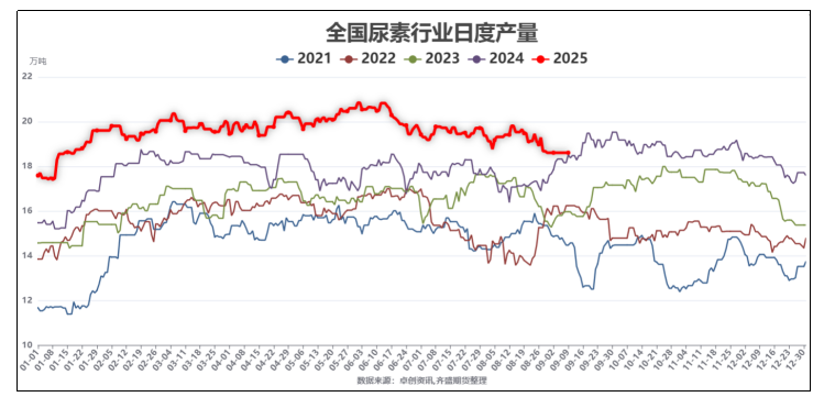 8月下旬以來,尿素行情維持陰跌態(tài)勢。供應(yīng)方面,產(chǎn)量保持高位,企業(yè)持續(xù)累庫。內(nèi)需方面,缺乏有效支撐,市場供大于求。不過,2025年中國實行配額制出口,前三批配額總量超過400萬噸,或是未來不可忽視的一個支撐點。