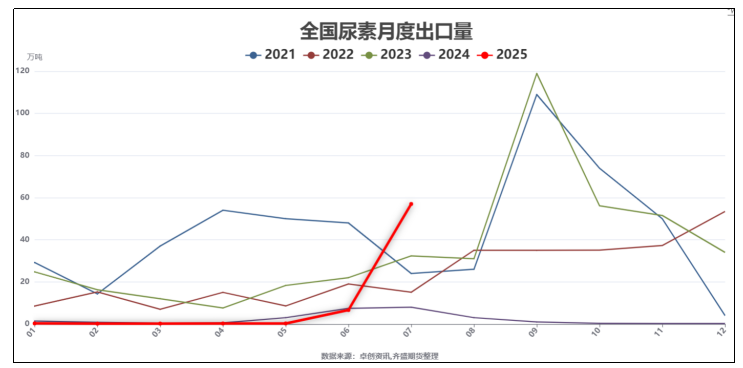 2025年,中國尿素實行配額制出口,三批配額總量超過400萬噸。7月份,中國尿素出口量為57萬噸,維持增加態(tài)勢,8—9月份出口量繼續(xù)增加的概率極大,而出口貨源的集港,短期或帶來一定支撐。