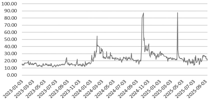 從期權持倉量PCR的角度來看,持倉量PCR能夠反映同時期市場多空雙方情緒。一般而言,持倉量PCR與市場情緒呈正相關關系,這是因為期權賣方一般是比較專業(yè)的投資者,持有賣出認沽期權說明其對后市行情是不看跌的。持倉量PCR的走勢與標的指數(shù)的走勢較為吻合。9月上旬,中證1000股指期權的持倉量PCR從110%上方回落至100%附近,其間中證1000指數(shù)也同步回調。9月11日,中證1000指數(shù)大幅上漲2.35%,中證1000股指期權的持倉量PCR也同步由上一交易日的99.49%大幅上升至108.41%,位于2023年以來的分位數(shù)水平由91.7%上升至96.3%,屬于較高的歷史分位數(shù)水平。這說明當前持不看空觀點的投資者占比處于歷史較高水平,換言之,持倉量PCR指標說明目前市場情緒整體偏向積極樂觀。