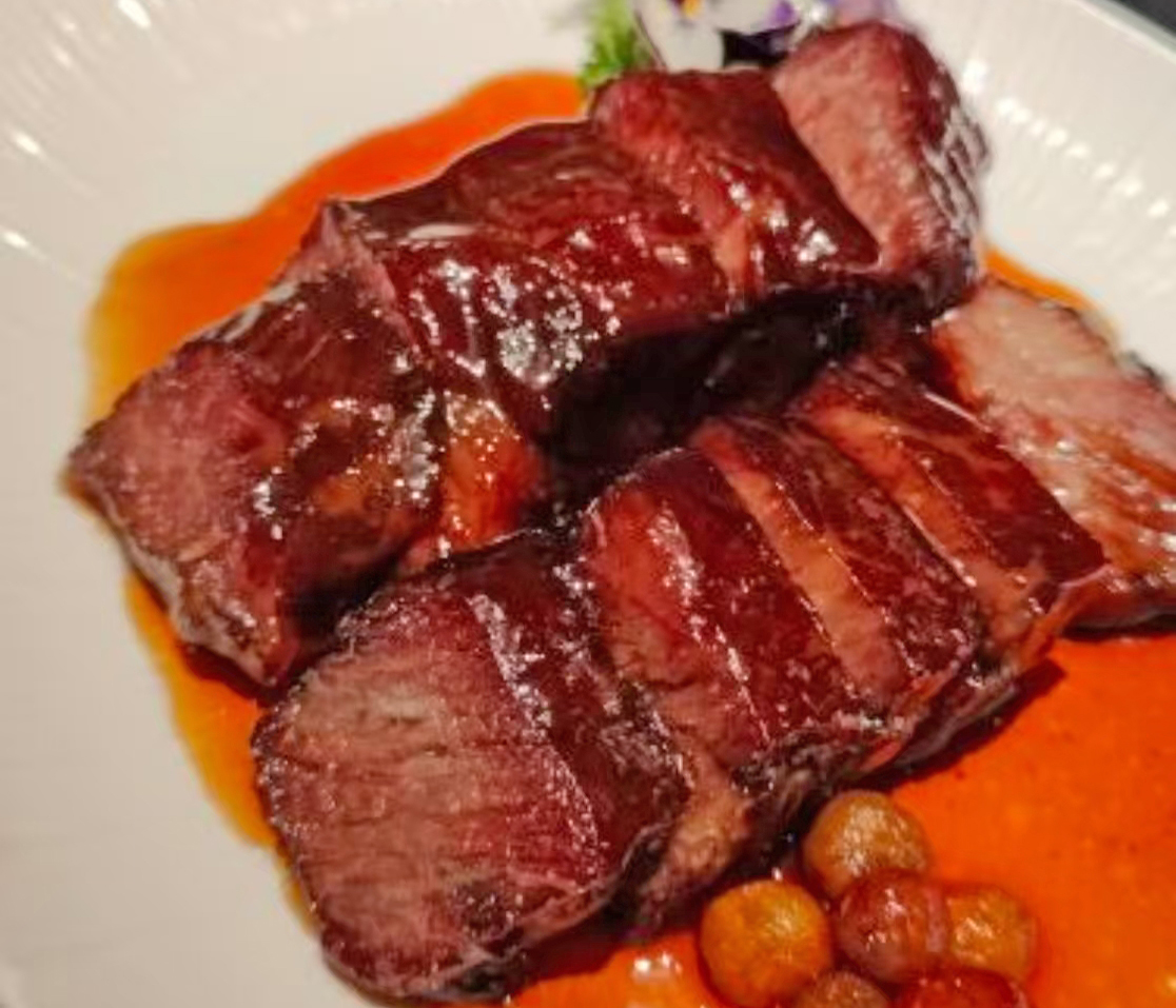 論及珠城一號(hào)的特色佳肴,我個(gè)人首推蜜桔牛叉拼黑豚叉燒。野生蜜糖浸泡一年的野山桔制成的蜜桔糖,腌制鹿心烏牛小排,180℃高溫?zé)两瓜?,?nèi)里嫩滑鎖汁。黑豚叉燒表面的蜜汁晶瑩剔透,肥瘦相間,帶著幸福的微甜。鐵板割烹波士頓龍蝦同樣驚艷四座。采用開放式鐵板現(xiàn)場烹制,廚師精準(zhǔn)掌控火候,龍蝦肉質(zhì)緊實(shí)彈牙,鮮甜滋味撲鼻而來。去年秋季推出的“九年百合松露焗波龍蝦”更是創(chuàng)意十足,將蘭州優(yōu)質(zhì)百合與珍稀黑松露完美融合,色澤誘人,香氣馥郁,味道醇厚,堪稱色香味俱全的經(jīng)典之作。順德拆魚肉羹則充分汲取“南番順”地道風(fēng)味之精華,巧妙將鮮美魚羹與滋補(bǔ)花膠相結(jié)合,湯汁濃稠鮮美,口感絲滑順暢,每一口都蘊(yùn)含著濃濃的嶺南風(fēng)情。