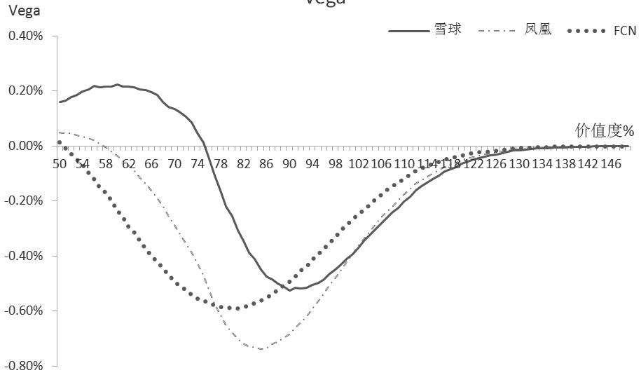 對(duì)比不同價(jià)值水平下的Delta可知,無(wú)論標(biāo)的價(jià)格如何變化,三種看漲結(jié)構(gòu)Delta始終大于零,均為做多標(biāo)的價(jià)格的期權(quán),在標(biāo)的上漲時(shí)有利。同時(shí),值得注意的是,在價(jià)格高于敲入線時(shí),Delta隨標(biāo)的上漲而變??;價(jià)格高于期初價(jià)時(shí),Delta不足0.4,且隨價(jià)格上漲越來(lái)越小。因此,此類結(jié)構(gòu)更適合用于震蕩或溫和上漲行情。另外,Delta在價(jià)值度顯著高于敲入線時(shí)小于1,在小幅下跌行情中為投資者提供了一定下跌“安全墊”。雖然FCN的Delta小于雪球和鳳凰,風(fēng)險(xiǎn)更低,但若標(biāo)的跌破敲入線后繼續(xù)大幅下跌,F(xiàn)CN的Delta也會(huì)快速升高,接近另兩種結(jié)構(gòu)。