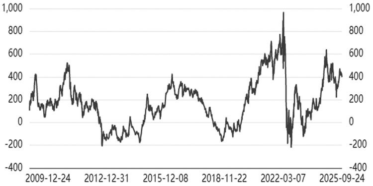 截至2025年9月24日,低硫燃料油與柴油之間的價差(FOGO價差)為398.24美元/噸,處于歷史均值附近。需要注意的是,F(xiàn)OGO價差直接決定了生產(chǎn)生物柴油的相對成本,一般而言,價差越大,往往意味著生產(chǎn)生物柴油的經(jīng)濟性越差,所需的補貼額度也就越高。