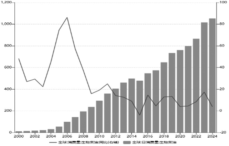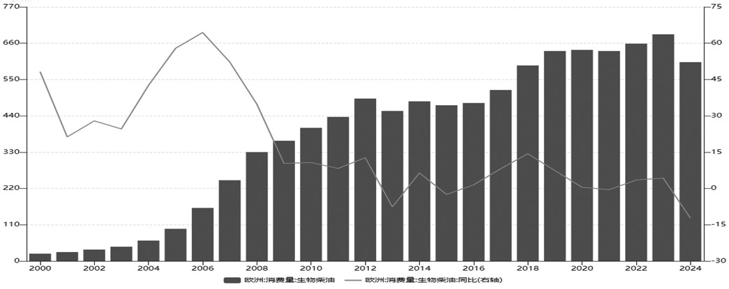 圖為歐洲生物柴油年消費量及同比變化(單位:拍焦耳、%)