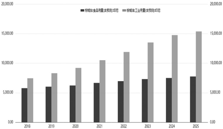 圖為印尼棕櫚油食品和工業(yè)用量(單位:千噸)