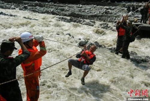 7月13日,四川消防官兵通過搭建繩橋的方式,將被困在國道213線映汶高速公路徹底關隧道附近的一名重傷員以及26名被困者成功轉移。目前,受持續(xù)強降雨影響,阿壩州汶川境內發(fā)生的山洪泥石流、滑坡、塌方等災害救援仍在持續(xù)中。圖為消防官兵空中繩橋轉移被困民眾。中新社發(fā)蒲建勇攝