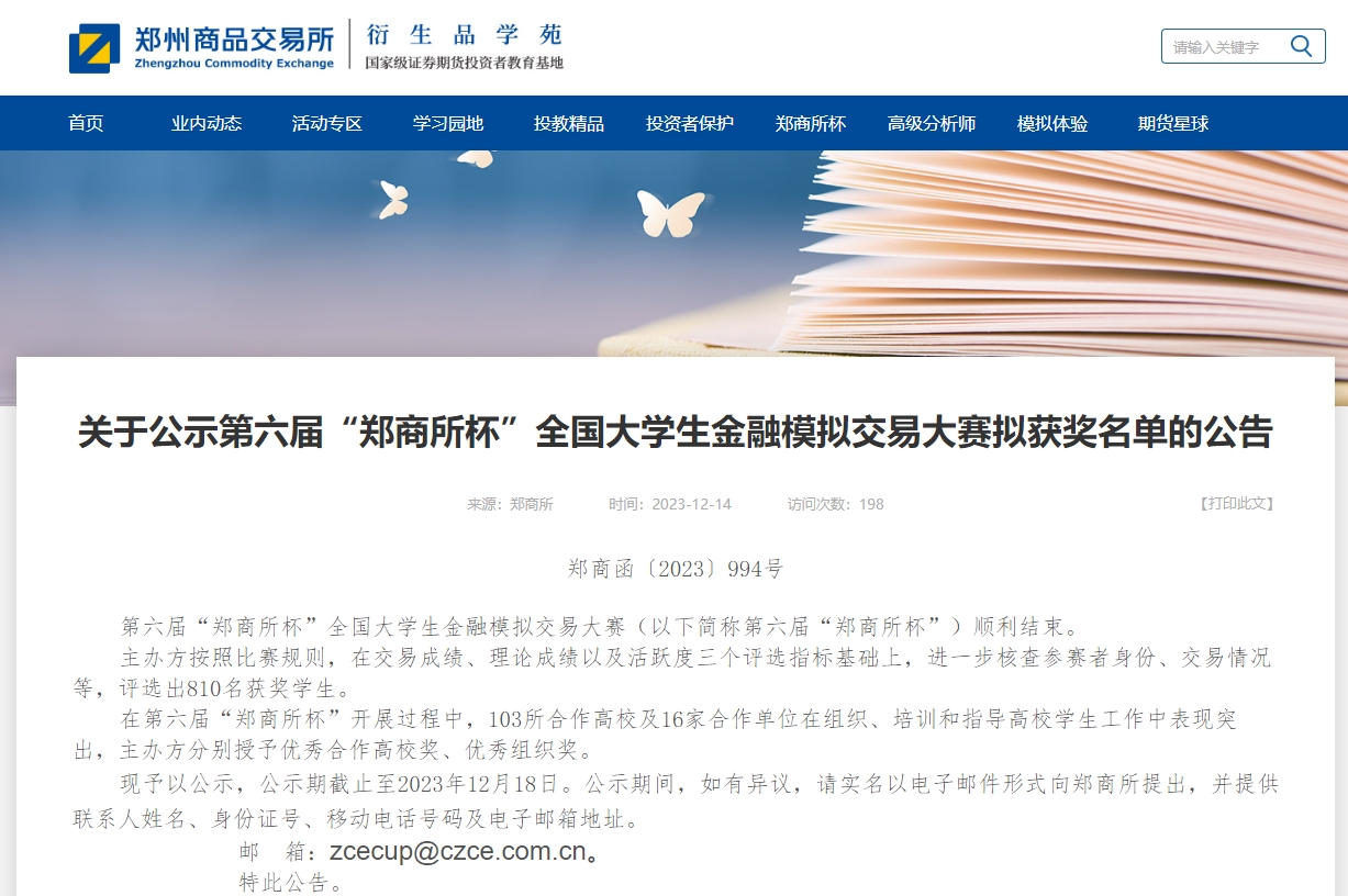 第六屆“鄭商所杯”全國(guó)大學(xué)生金融模擬交易大賽(以下簡(jiǎn)稱第六屆“鄭商所杯”)順利結(jié)束。主辦方按照比賽規(guī)則,在交易成績(jī)、理論成績(jī)以及活躍度三個(gè)評(píng)選指標(biāo)基礎(chǔ)上,進(jìn)一步核查參賽者身份、交易情況等,評(píng)選出810名獲獎(jiǎng)學(xué)生。