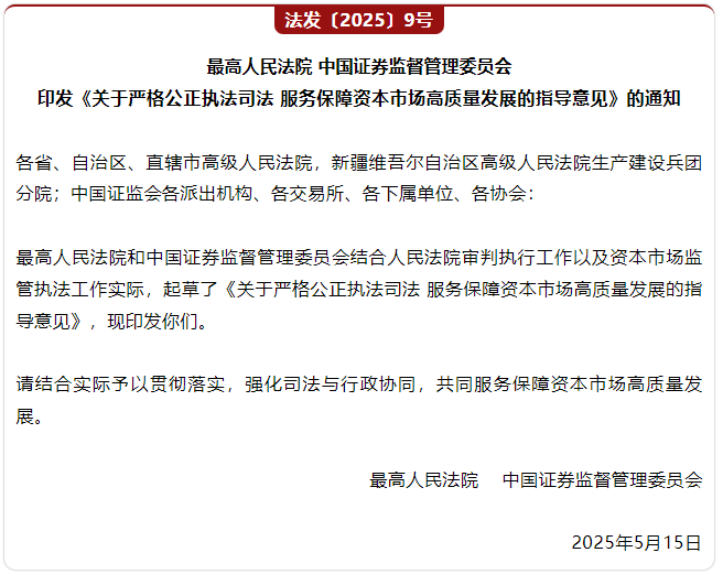 2025年5月15日,最高人民法院、中國(guó)證監(jiān)會(huì)聯(lián)合發(fā)布《關(guān)于嚴(yán)格公正執(zhí)法司法 服務(wù)保障資本市場(chǎng)高質(zhì)量發(fā)展的指導(dǎo)意見》。